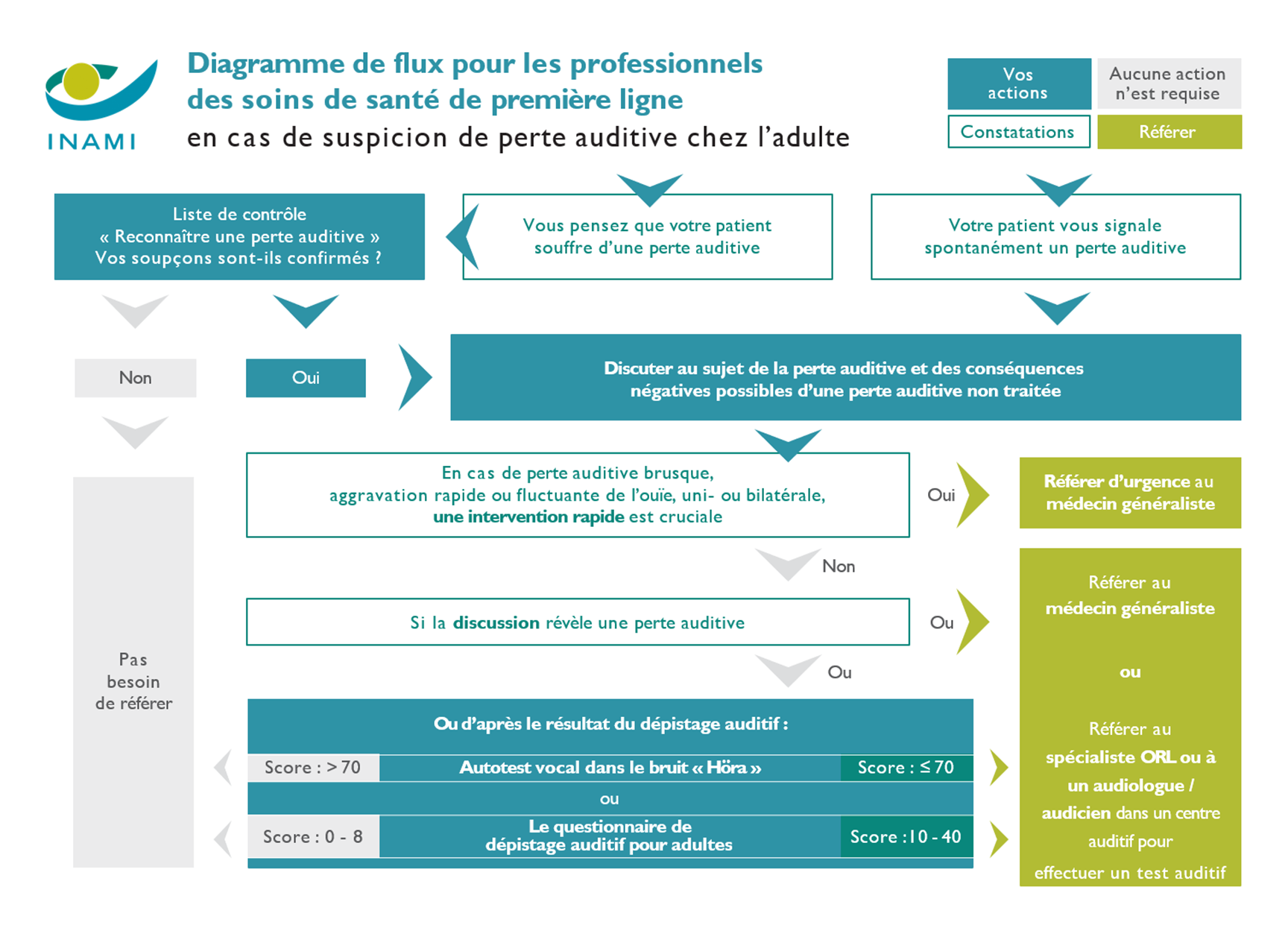 - Si le score est supérieur à 70 : dans ce cas, l’audition est probablement bonne et il n’est pas nécessaire d’orienter le patient plus loin.