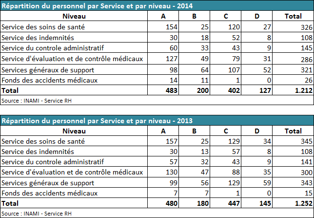 Nous constatons une importante diminution du personnel en 2014, dans les niveaux C et D. Le personnel des niveaux A et B, lui, augmente légèrement. En 2014, le Service des soins de santé (SdSS) consitue le plus « gros » service.