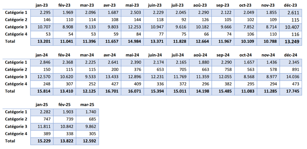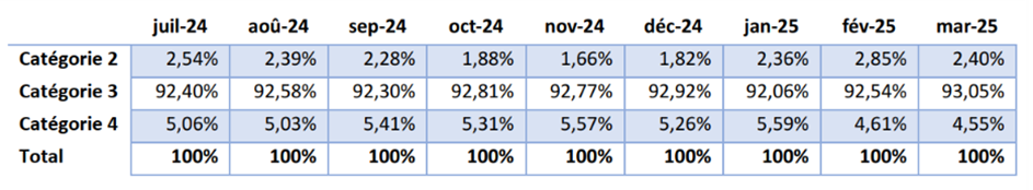 Le tableau 15 présente la répartition en pourcentage des personnes au sein des trois catégories. Ces pourcentages montrent, à l'exception des mois de février et mars 2025, une évolution légèrement positive du nombre de personnes dans la catégorie 4.