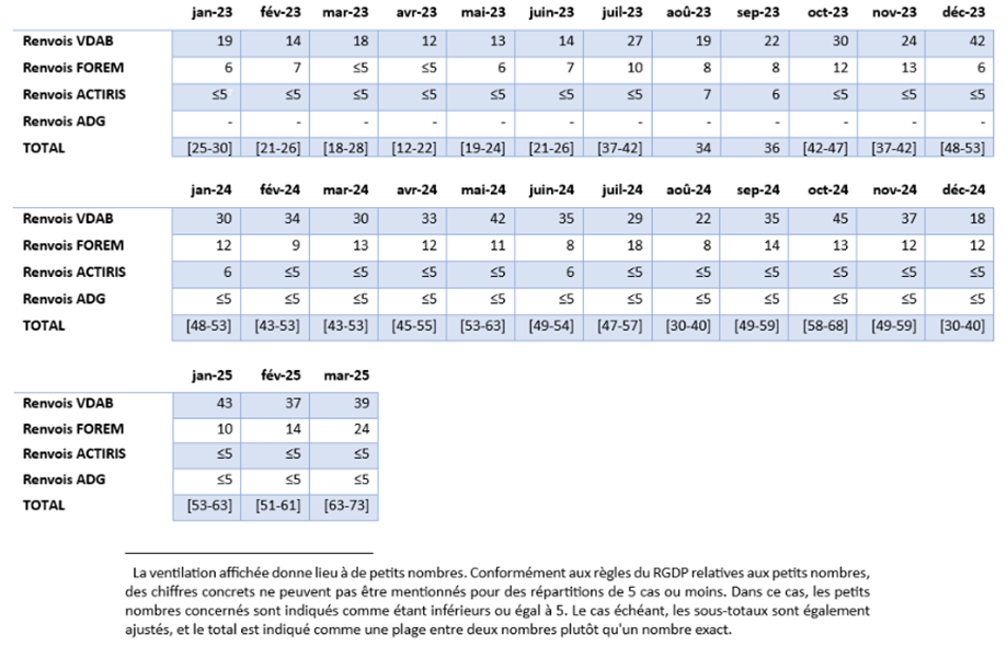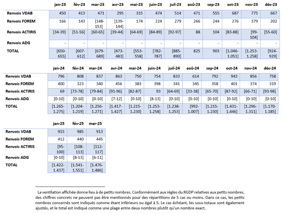 Les chiffres pour les renvois sont affichés pour le régime des travailleurs salariés et le régime des travailleurs indépendants afin de permettre une comparaison avec le nombre de présentations auprès du service régional de l'emploi où cette ventilation n’est pas possible. Ceci permet une comparaison correcte des chiffres entre eux.