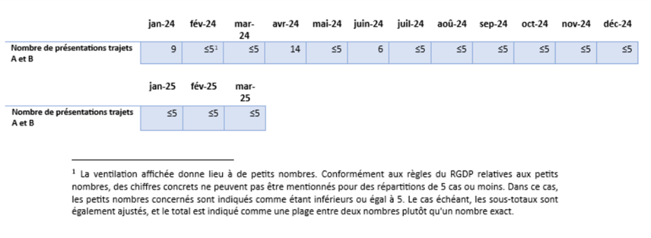 En ce qui concerne le nombre de présentations auprès dʼActiris, tant dans le cadre des trajets A et B que du trajet C, depuis le lancement du nouvel accord-cadre à Bruxelles en janvier 2023, le nombre de demandes a augmenté.