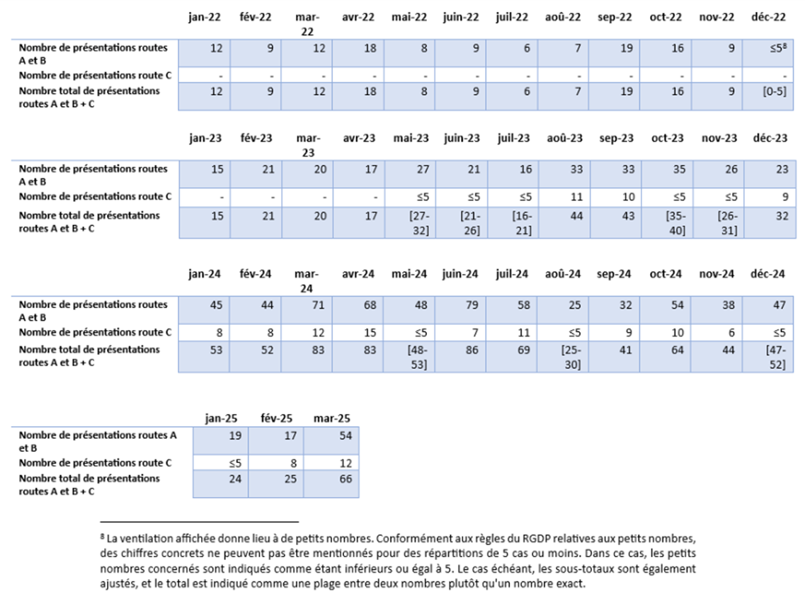 Le graphique 30 donne un aperçu du nombre total de présentations auprès des services régionaux de l'emploi, tant dans le cadre des trajets A et B que du trajet C. Une tendance générale à la hausse peut être observée, avec un total de 5.612 présentations en 2022, en 2023 le total est passé à 8.524 présentations et en 2024 il y en a eu 14.290. Pour le premier trimestre 2025, il y en avait déjà 4.224.