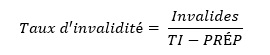 Le taux d’invalidité se réfère au pourcentage du nombre de personnes reconnues invalides à une date donnée par rapport au nombre de titulaires indemnisables (=TI). Conformément à l’article 86 §1er de la loi coordonnée du 14 juillet 1994, un titulaire indemnisable a droit à des indemnités en cas de maladie. En outre, cette formule utilise le nombre de titulaires indemnisables moins le nombre de prépensionnés (= TI - PRÉP). Cette correction du nombre de titulaires indemnisables est due au fait que - bien que les prépensionnés aient théoriquement également droit à des indemnités - ils n’exercent jamais ce droit car ils n’en tirent aucun avantage financier. De plus, les fonctionnaires et les indépendants ne sont pas pris en compte dans ce calcul. Ainsi, le taux d’invalidité reflète le pourcentage de titulaires indemnisables qui sont invalides, c’est-à-dire la probabilité qu’un titulaire indemnisable soit invalide.
