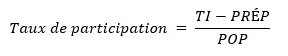 Dans cette partie du Baromètre ReAT, le taux de participation est calculé en fonction du nombre de titulaires indemnisables – C'est-à-dire les actifs, les chômeurs et les invalides. Conformément à l’article 86 §1er de la loi coordonnée du 14 juillet 1994, ces personnes ont droit à des indemnités en cas de maladie. Le taux de participation correspond donc au pourcentage de titulaires indemnisables (=TI) salariés par rapport à la population belge totale âgée de 20 à 64 ans (=POP). Il est important de noter que cette formule repose sur le nombre de titulaires indemnisables moins le nombre de prépensionnés (= TI-PRÉP). Cette correction du nombre de titulaires indemnisables est due au fait que - bien que les prépensionnés aient théoriquement également droit à des indemnités - ils n’exercent jamais ce droit car ils n’en tirent aucun avantage financier. De plus, les fonctionnaires et les indépendants ne sont pas pris en compte dans ce calcul.