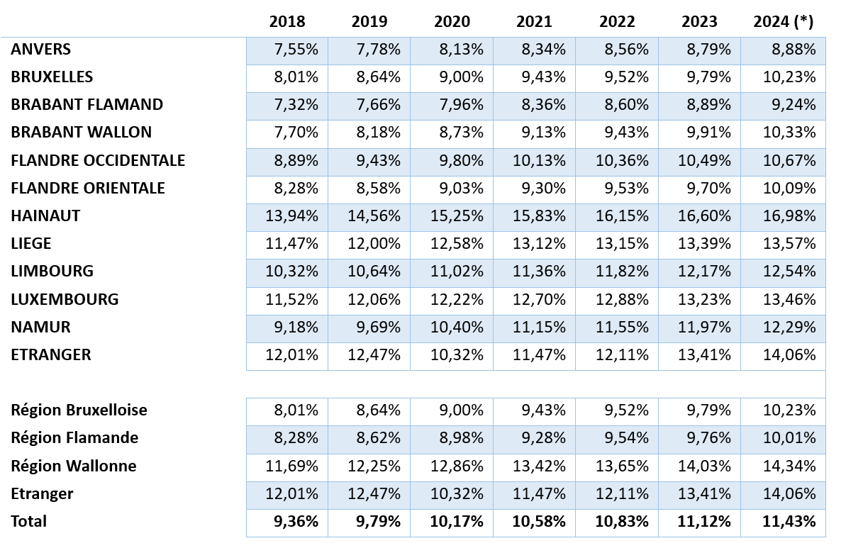 En ce qui concerne la répartition par province, il est à noter que l’augmentation en Région wallonne est principalement due à une forte augmentation à Namur (44,37 %) et dans le Brabant wallon (41,60 %).