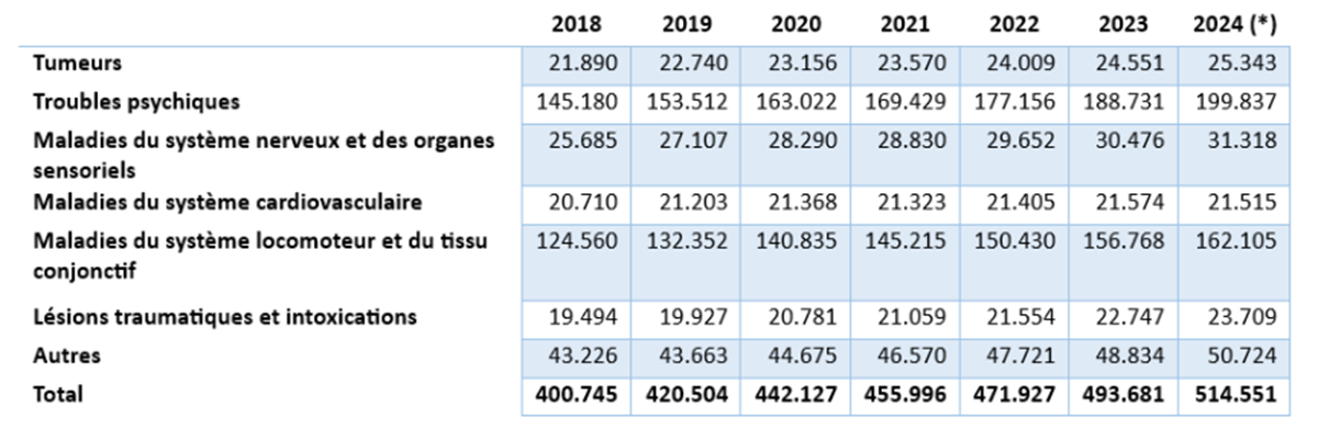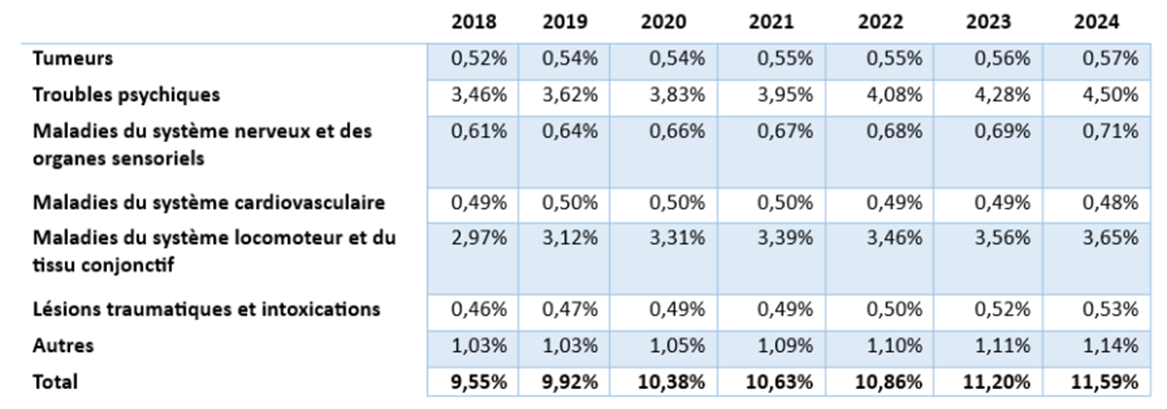 Le Tableau 9 présente l’évolution du taux d’invalidité pour la période 2018-2024, ventilée par groupe de maladies.