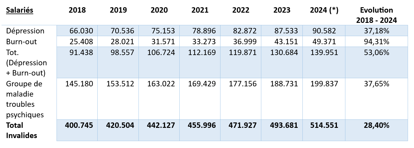 Comme le montrent les tableaux précédents, les troubles mentaux (GM5) et les maladies du système locomoteur et du tissu conjonctif (GM13) constituent des défis importants. En ce qui concerne le groupe de maladies « troubles psychiques », une analyse plus détaillée dans le Tableau 8 des deux principaux diagnostics de ce groupe de maladies (dépression et burn-out) met en évidence que la part des titulaires souffrant de burn-out ou de dépression dans le nombre total de titulaires atteints de troubles mentaux a également augmenté de manière significative au cours de la période observée : alors que ce pourcentage était de 62,98 % en 2018, celui-ci est passé à 70,03 % en 2024. Plus d’un quart des titulaires en invalidité au 31 décembre 2024 souffrent de burn-out ou de dépression (27,20 %), soit une augmentation de 4,38 % par rapport à la situation au 31 décembre 2018 (22,82 %).
