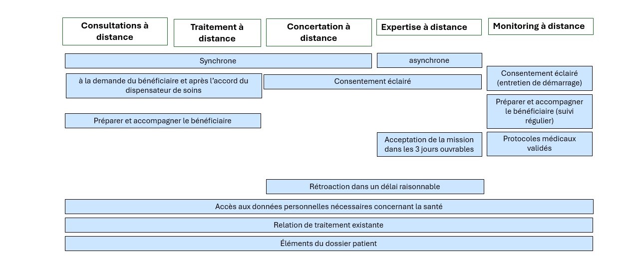 Toute forme de soins à distance est soumise à des conditions spécifiques auxquelles les soins doivent répondre :