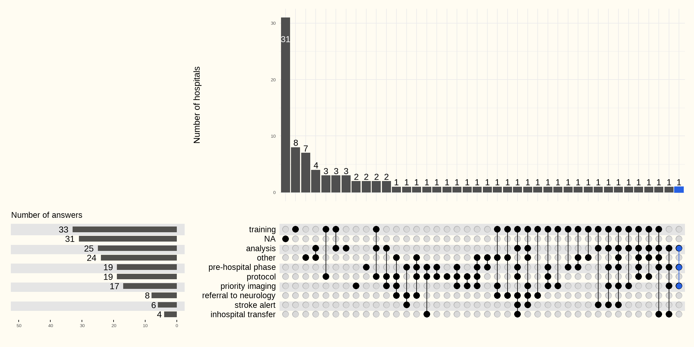 - formation des différentes disciplines impliquées dans la prise en charge d’un patient suspecté d’AVC (33 hôpitaux). Certains hôpitaux mentionnent également le personnel administratif du service des urgences