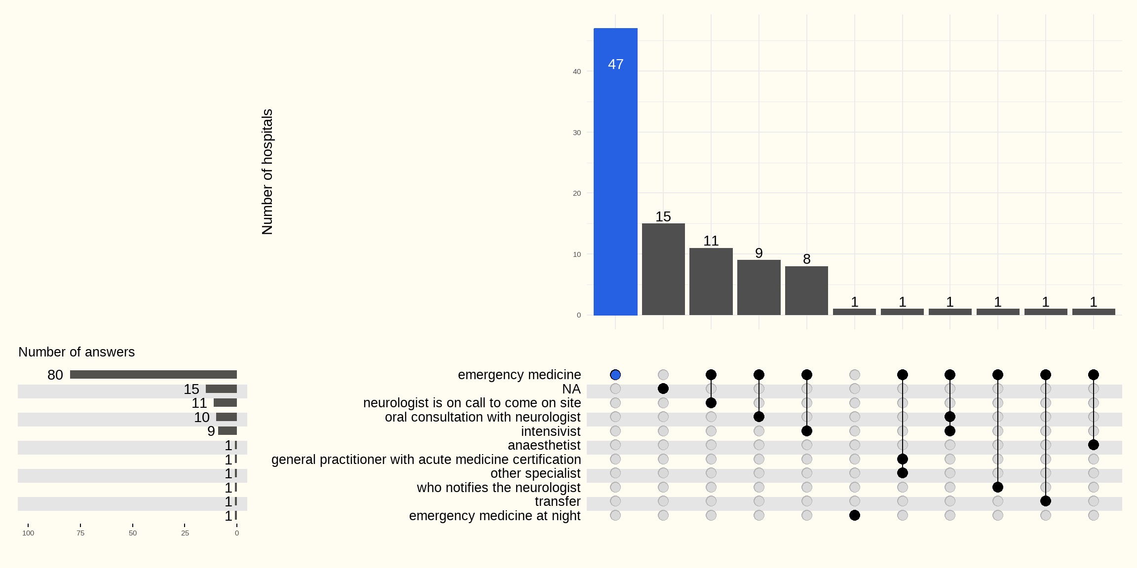 Dans 79 hôpitaux, les hôpitaux déclarent que le neurologue (en formation ou spécialiste) n’est pas présent 24 heures sur 24. Dans ces hôpitaux, c’est le médecin des urgences qui prend en charge un patient victime d’un AVC en l’absence du neurologue.