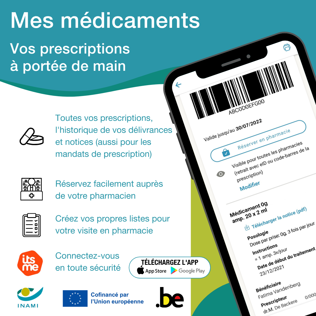 Avec « Mes Médicaments », vous pouvez gérer vos prescriptions ainsi que celles des personnes de votre choix en ligne via le site web MaSanté et notre application mobile. Grâce à la carte d'identité électronique (eID), il n’était déjà plus nécessaire de présenter la preuve papier d’une prescription électronique pour pouvoir retirer un médicament en pharmacie.