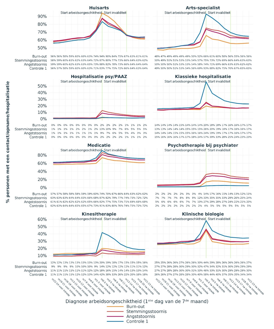Wie meer dan zes maanden arbeidsongeschikt is als gevolg van één van de hogervermelde psychosociale aandoeningen, maakt vaker gebruik van de beschikbare gezondheidszorg. In vergelijking met personen die geen erkenning van arbeidsongeschiktheid hebben, consulteren ze vaker een arts (huisarts of specialist) en nemen ze vaker geneesmiddelen, vooral antidepressiva en antipsychotica. Een vijfde tot een kwart van deze personen wordt bovendien geconfronteerd met een ziekenhuisopname tijdens de eerste drie maanden van de arbeidsongeschiktheid.