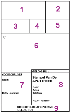 - de stempel van de apotheek met naam, adres, telefoonnummer en RIZIV-nummer (8)