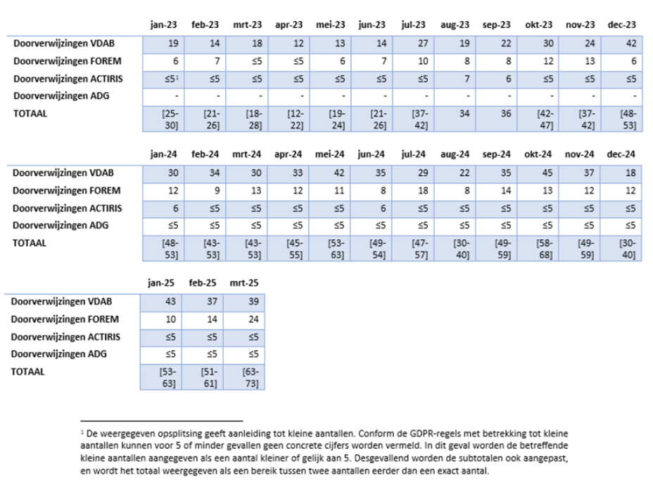 Daarnaast geeft deze tabel ook een overzicht van het aantal aanmeldingen binnen routing C bij Actiris, opgesplitst per maand. Dit pilootproject is opgestart in mei 2023. De aanmeldingen worden geteld in de maand waarin deze hebben plaatsgevonden. De hier weergegeven cijfers betreffen zowel de loontrekkenden als de zelfstandigen.