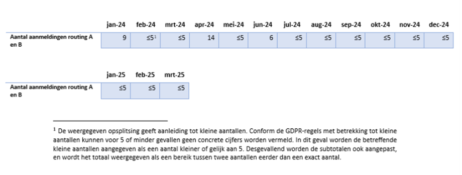 Figuur 30 geeft een overzicht van het totaal aantal aanmeldingen van zowel route A en B als route C. Er is een algemeen stijgende trend op te merken, met een totaal van 5.612 aanmeldingen in 2022, gevolgd door een stijging naar 8.524 aanmeldingen in 2023 en een totaal van 14.290 aanmeldingen in 2024. In het eerste kwartaal van 2025 waren er reeds 4.224 aanmeldingen.