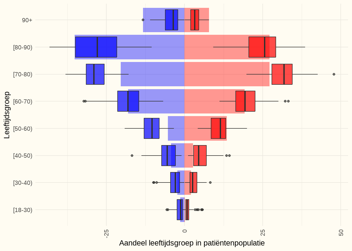 Om correcte vergelijkingen inzake zorgaspecten tussen ziekenhuizen en landen mogelijk te maken dient er rekening gehouden te worden met de belangrijkste kenmerken van hun dialysepatiëntenpopulatie. Leeftijd en geslacht zijn daar deel van. Onderstaande boxplot (Figuur 4.1) toont de volledige (HD en PD) populatie per leeftijdscategorie (in 10 jaarsintervallen) en per geslacht. De box plot (donker blauw en roos) toont het overzicht van alle ziekenhuizen terwijl de bar plot (in iets lichtere kleuren op de achtergrond) de leeftijdsverdeling in 1 bepaald ziekenhuis toont. Data van 1/1/2017-31/12/2021.