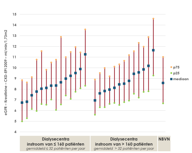 Bespreking: Op 1 centrum na blijven alle centra met het merendeel (p75) van hun eGFR waardes bij opstart dialyse onder de 15mL/min/1.73 m2.