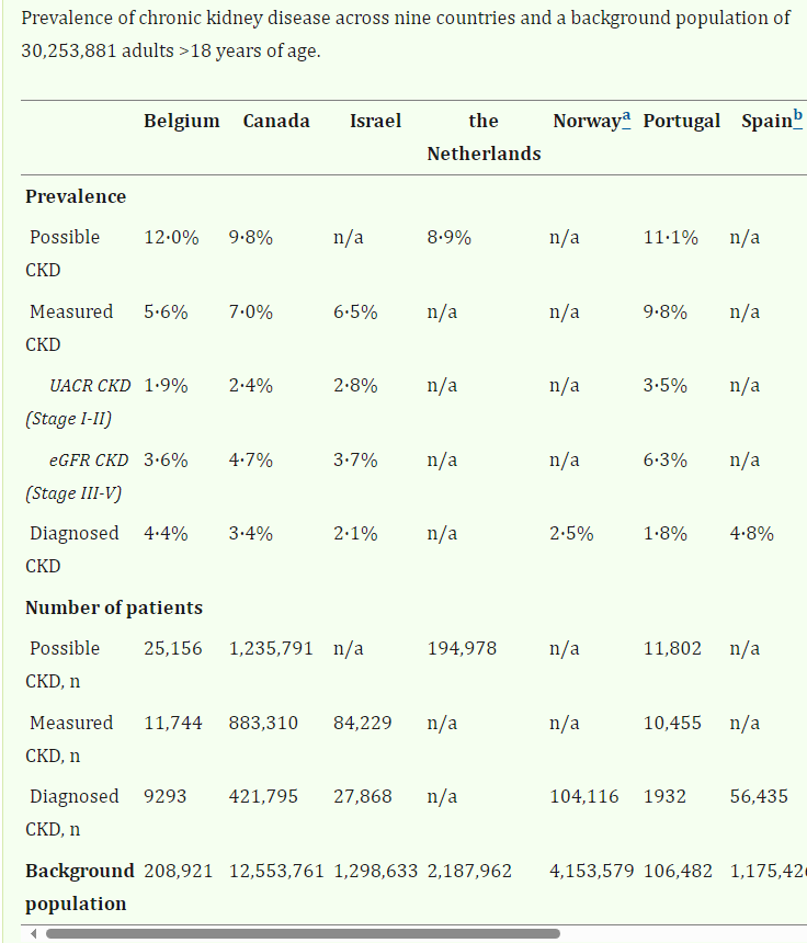 Het verschil inzake prevalentie op basis van “possible CKD” en “measured CKD” was het grootst in België van alle landen in de studie die daar data over hadden.