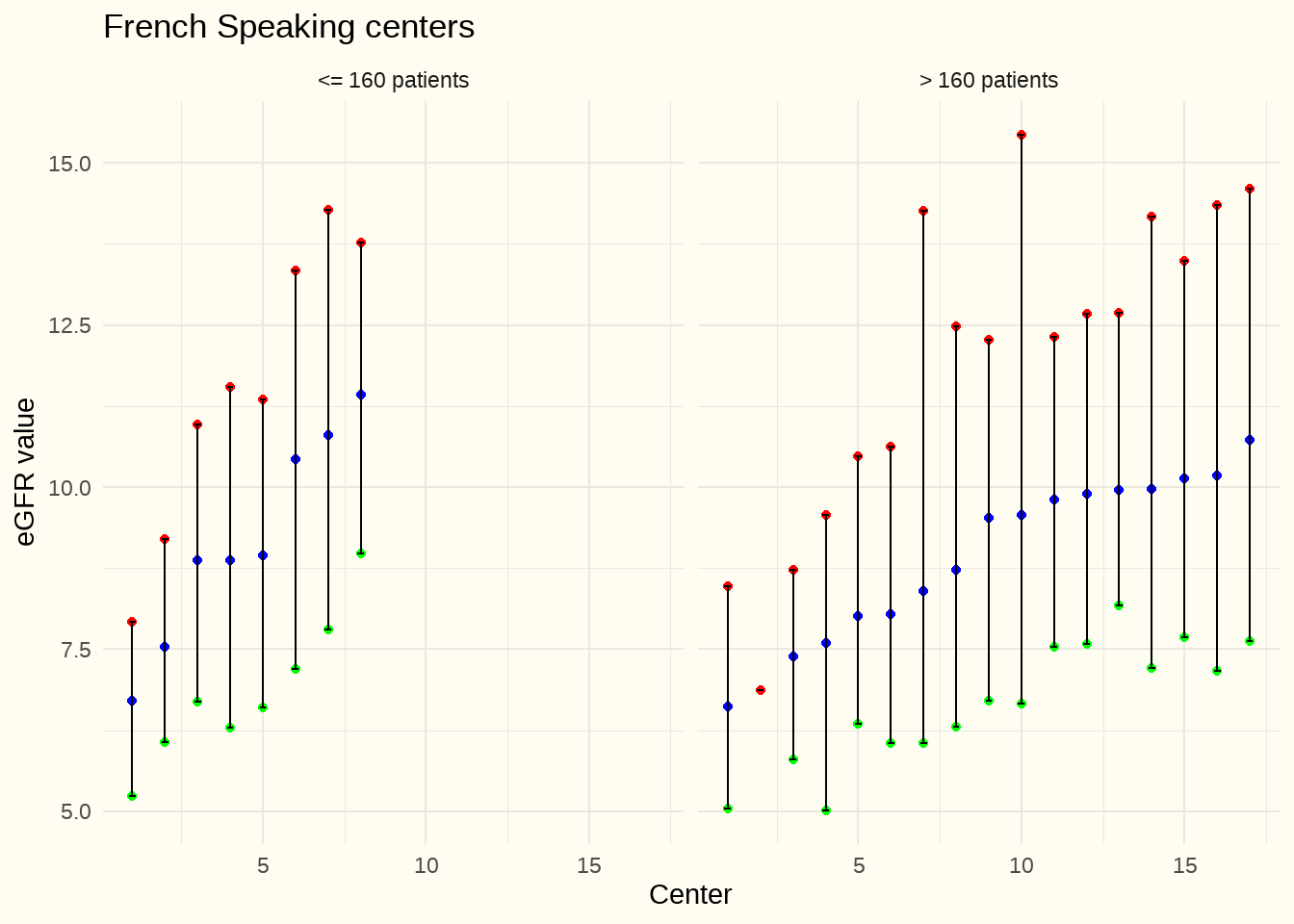 Een vergelijkbare dataset -over dezelfde observatieperiode en met de zelfde berekeningswijze voor eGFR- ons bezorgd door de Groupement des Néphrologues Francophones de Belgique (GNFB), werd naar analogie verwerkt in volgende grafiek. Voor de vergelijkbaarheid werden de centra volgens dezelfde afkapwaarde (160 patiënten) opgedeeld en ook hier werd de mediaan waarde (blauw) te samen met de p75 (rood punt) en de p25 (groen punt) weerhouden. Het betrof in totaal 4997 patiënten. De kreatininewaarde bij dialysestart ontbrak gemiddeld bij 35% (2-99%) van de patiënten.