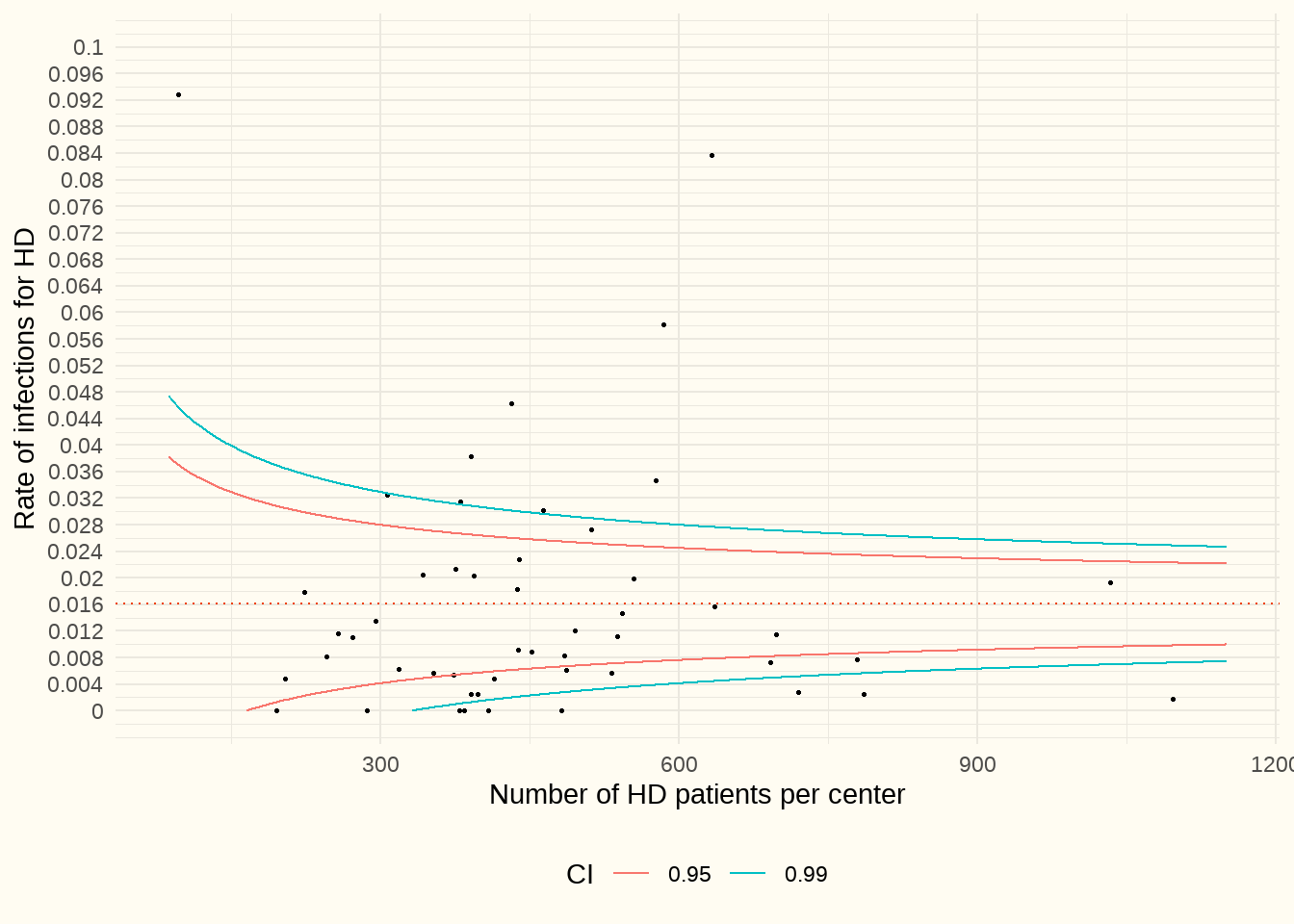 In onderstaande funnelplot (Figuur 6.3) geven we per centrum (X-as), de ratio weer van het aantal ziekenhuisverblijven t.g.v. toegangsweg gerelateerde infecties1 ten opzichte van het aantal HD patiënten in dat centrum (Y-as). Om zo min mogelijk mix te krijgen van hemodialyse en peritoneaal dialyse patiënten, werden de patiënten die een PD katheter kregen tijdens de observatieperiode uit deze analyse weggelaten. We gebruikten doc P data over de observatieperiode 1/1/2017-31/12/2021. Patiënten die in meerdere centra werden opgenomen, werden in elk centrum meegerekend.