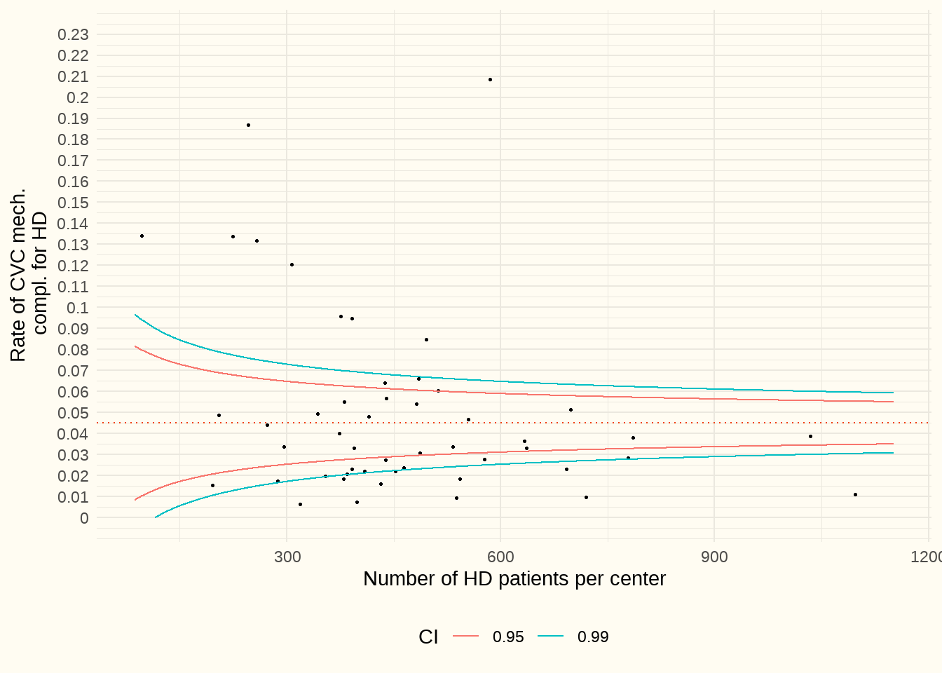De mechanische complicaties werden opgedeeld in de volgende twee funnelplots waarbij de ratio van verblijven t.g.v. toegangsweg gerelateerde mechanische complicaties ten opzicht van het aantal HD patiënten in dat centrum (Y-as) wordt geplot ten opzichte van de grootte van het centrum (via pseudonomenclatuur codes HD) (X-as).