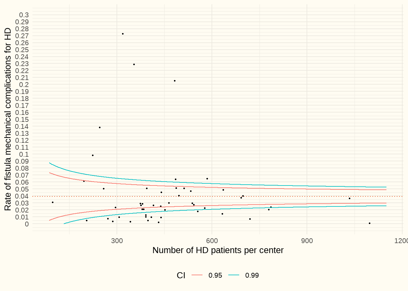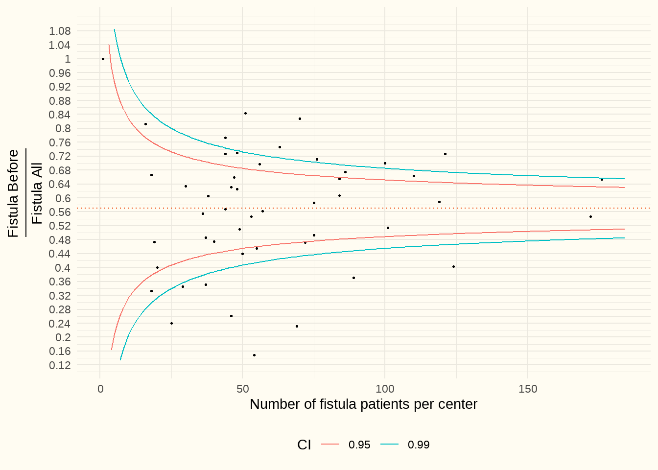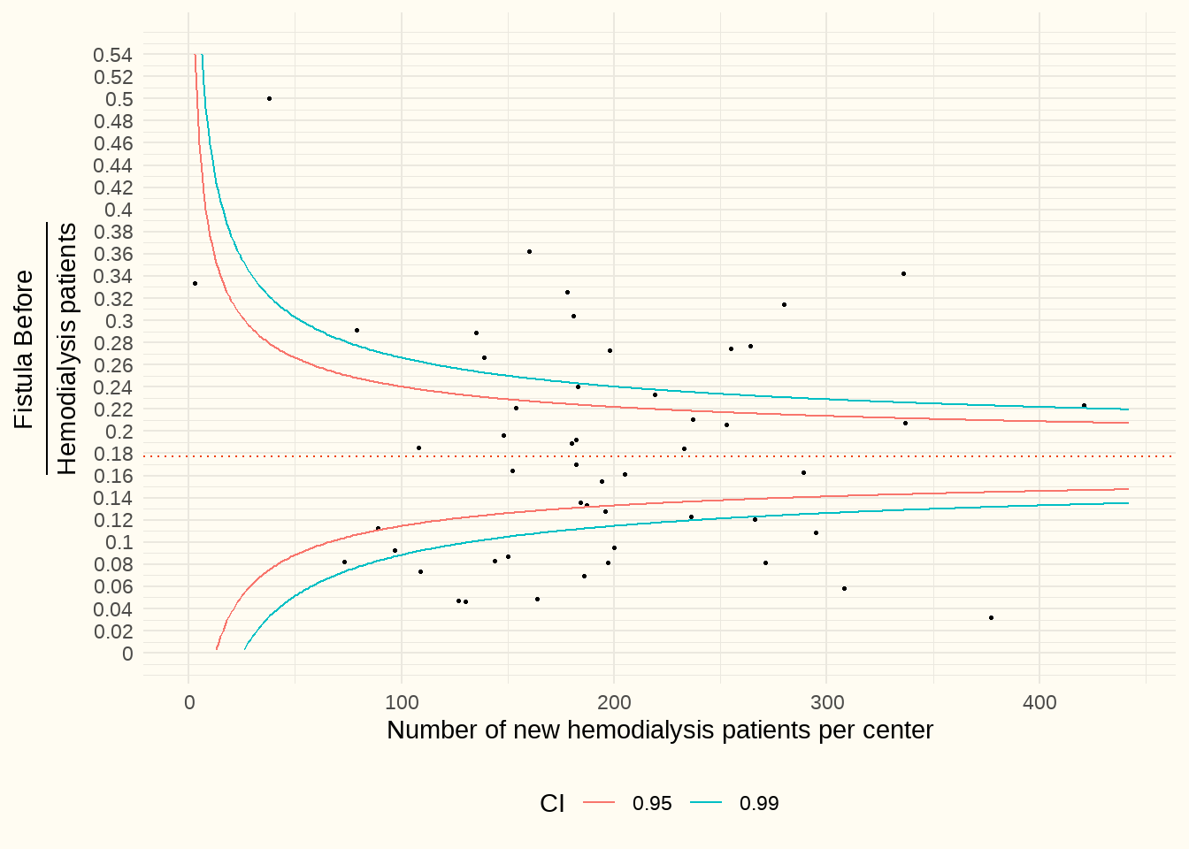 Om het probleem inzake contra-indicaties te vermijden werd onderstaande funnelplot gemaakt. Hierop is de verhouding van de AV-fistels aangelegd vóór opstart van hemodialyse versus alle aangelegde fistels, weergegeven (Y-as). Dit in functie van het aantal HD patiënten in het centrum (X-as).