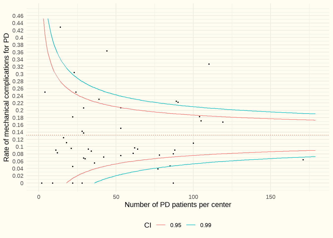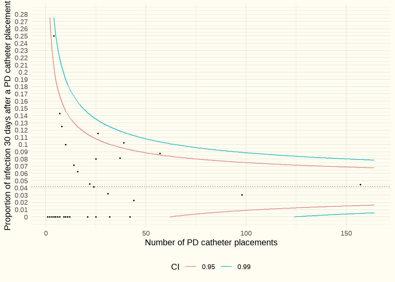 Figuur 7.3 toont een funnelplot. Hierin wordt de verhouding uitgezet van ziekenhuisopnames (dag en klassiek) voor toegangsweg gerelateerde infecties (ICD code T85.71, sepsis of peritonitis) binnen de 30 dagen na plaatsing van een PD katheter, ten opzichte van het aantal aangelegde PD katheters (Y-as). In X-as grootte van het centrum (op basis van het aantal PD katheter plaatsingen).