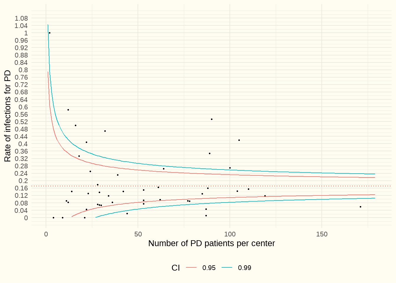 Bespreking: De mediaan is 9.4%. We zien 4 centra die onder de onderste 0.99 CI blauwe lijn liggen en het daarmee significant beter doen dan het gewogen gemiddelde (=positieve uitschieters). Daartegenover staan 6 centra die hoger scoren dan de bovenste 0.99 CI en dus significant minder goede resultaten behalen op basis van onze data. Het absolute aantal complicaties lag in vele centra laag, omdat het vaak hele kleine aantallen PD patiënten betrof. In drie centra vonden we geen PD activiteiten op basis van de pseudocodes voor PD. Deze 4 staan niet op deze grafiek omdat daarvan geen ratio kan worden gemaakt. Het is mogelijk dat sommige ziekenhuizen veel patiënten met complicaties doorgestuurd krijgen en dat dit hun cijfers negatief beïnvloedt. Daarom is de bedoeling van deze benchmark dat het ziekenhuis aan zelfreflectie doet en indien een minder goed resultaat niet te verklaren is, de nodige verbeteracties onderneemt.