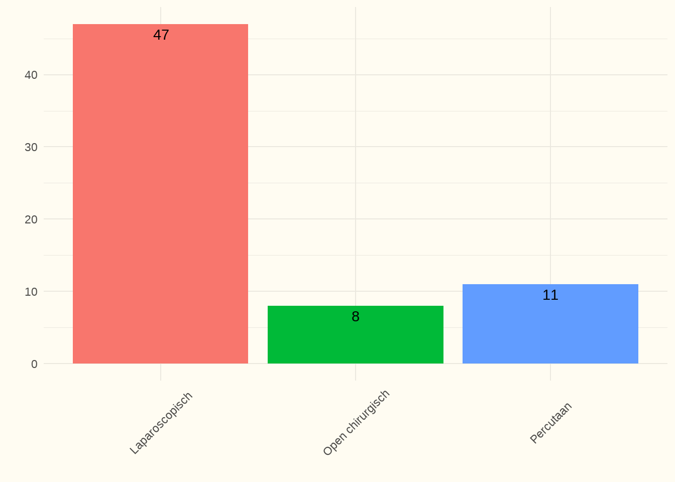 Bespreking: 96% van de respondenten gaf aan dat bij hun patiënten (vooral) laparoscopische PD katheterplaatsingen gebeuren. Twee centra hebben deze vraag niet beantwoord.