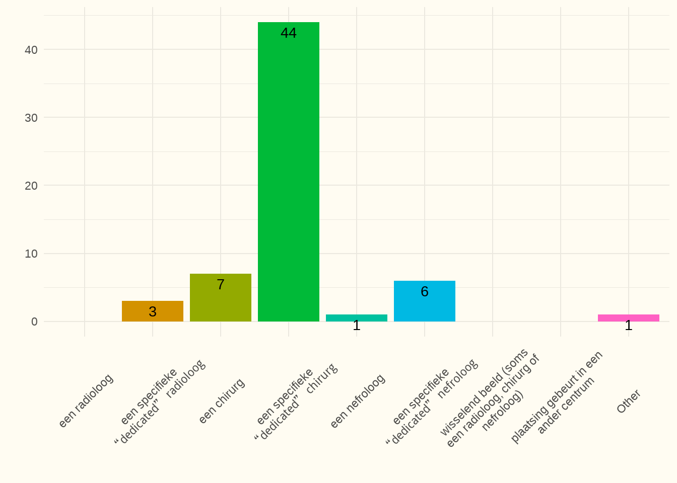 Bespreking: 90% van de respondenten gaf aan dat de plaatsing door één specifieke chirurg gebeurt. In 7 centra gebeurt het (ook) door een (al dan niet specifieke) nefroloog en in 3 door een specifieke radioloog. Twee centra beantwoordden deze vraag niet. Sommige centra verwijzen hiervoor door naar een ter zake ervaren chirurg in een ander ziekenhuis.