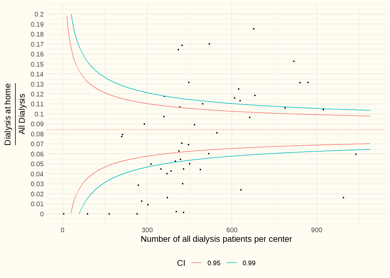 Onderstaande funnelplot in Figuur 9.1 toont op de Y-as het aandeel thuisdialyse (peritoneaal dialyse en thuishemodialyse) ten opzichte van alle dialysevormen (PD, HHD, CAD en HD) op basis van het aantal therapiedagen (gecorrigeerd voor 7 dagen versus 3 dagen therapieschema’s). Op de X as is het totaal aantal dialysepatiënten per centrum uitgezet (op basis pseudo nomenclatuurcodes). Dit voor de periode 2017-2021.