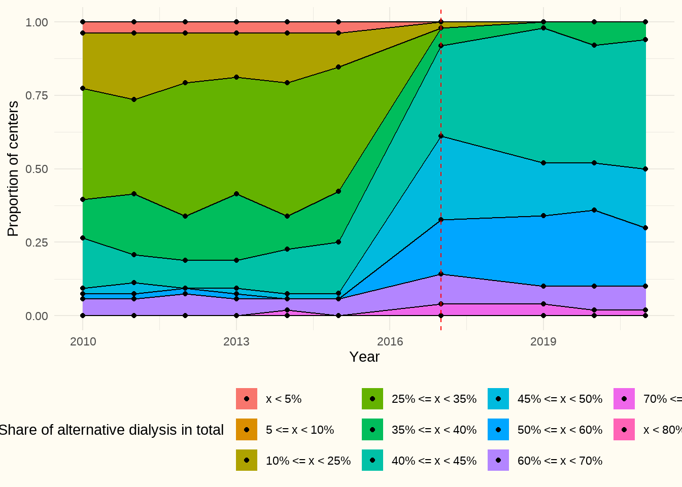Er werd met de RIZIV conventie van 2016 een duidelijke incentive ingebouwd om tot meer diverse behandelvormen en daardoor meer keuzemogelijkheden voor de patiënt te komen, conform de aanbevelingen van het KCE uit 2010 (Organisatie en financiering van chronische dialyse in België). In de conventie werden percentages van patiënten op alternatieve dialyse behandeling gekoppeld aan betere terugbetalingsaspecten volgens onderstaand schema.