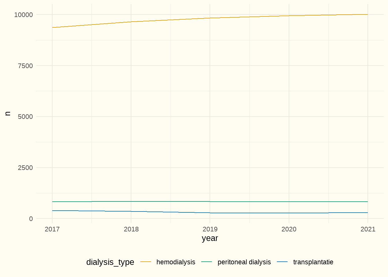 Onderstaande figuur toont de evolutie van het aantal patiënten (n) op HD, PD en met transplantatie (prevalentiedata) voor de jaren 2017 t.e.m. 2021 op van onze administratieve data.