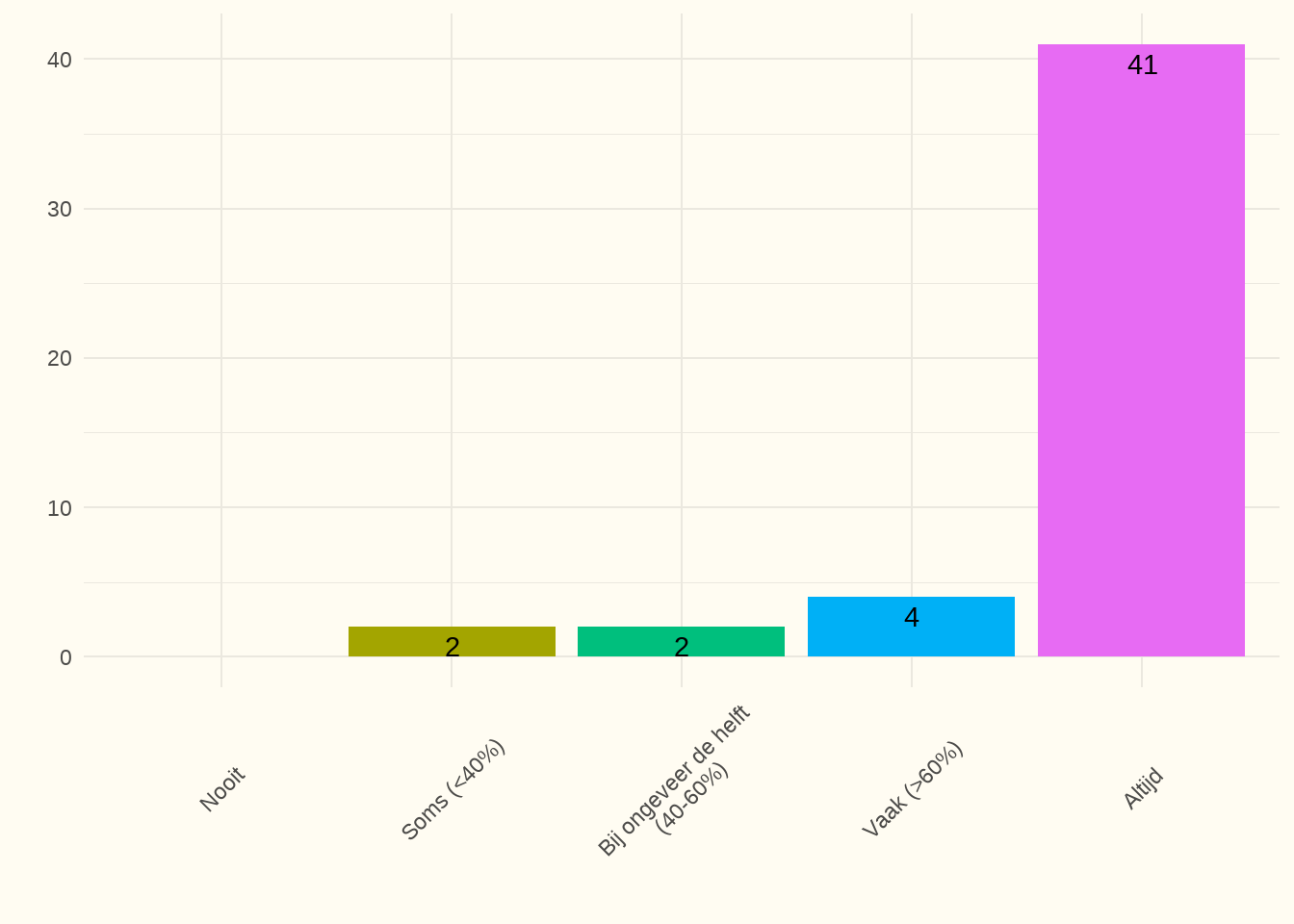 Bespreking: Bij 84% van de respondenten werd dit altijd aangeleerd en meegegeven. Twee centra hebben deze vraag niet beantwoord.