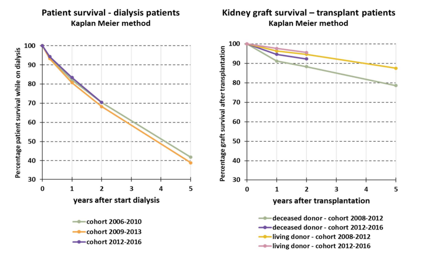 Op Europees niveau stelde men: “Excess end-stage kidney disease–related mortality rates have decreased substantially over time among adults recorded in the European Renal Association–European Dialysis and Transplant Association (ERA-EDTA) Registry, with the largest relative decreases in the youngest adults and the largest absolute decreases in the oldest adults… Possible contributors to the observed improvements include technical advances in dialysis, changes in dialysis access practices, new medications, uptake of clinical practice guidelines, increased access to transplantation for the elderly, improved allograft survival, and change in selection of patients for RRT, among others. However, despite evident improvements, this study also emphasizes the continued high excess mortality rates, particularly among those treated with dialysis. It also highlights important differences in excess mortality risks in different countries and possible increases in the excess risk of mortality in elderly transplant recipients over time, driven by increases in atheromatous cardiovascular disease–-related and malignancy-related mortality.” (Foster 2020).