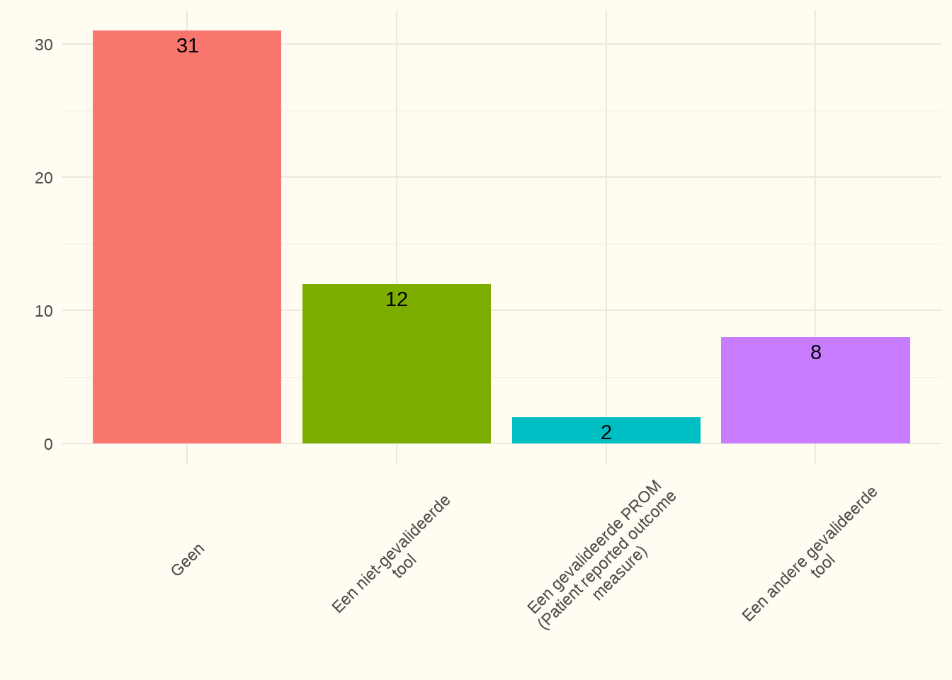 Bespreking: 61% van de centra meldden dat er geen instrumenten worden gebruikt. Slechts 2 centra gaven aan een gevalideerde PROM te gebruiken. Het systematische gebruik van een gevalideerde schaal waarmee men de levenskwaliteit van patiënten objectief kan opvolgen is dringend nodig.